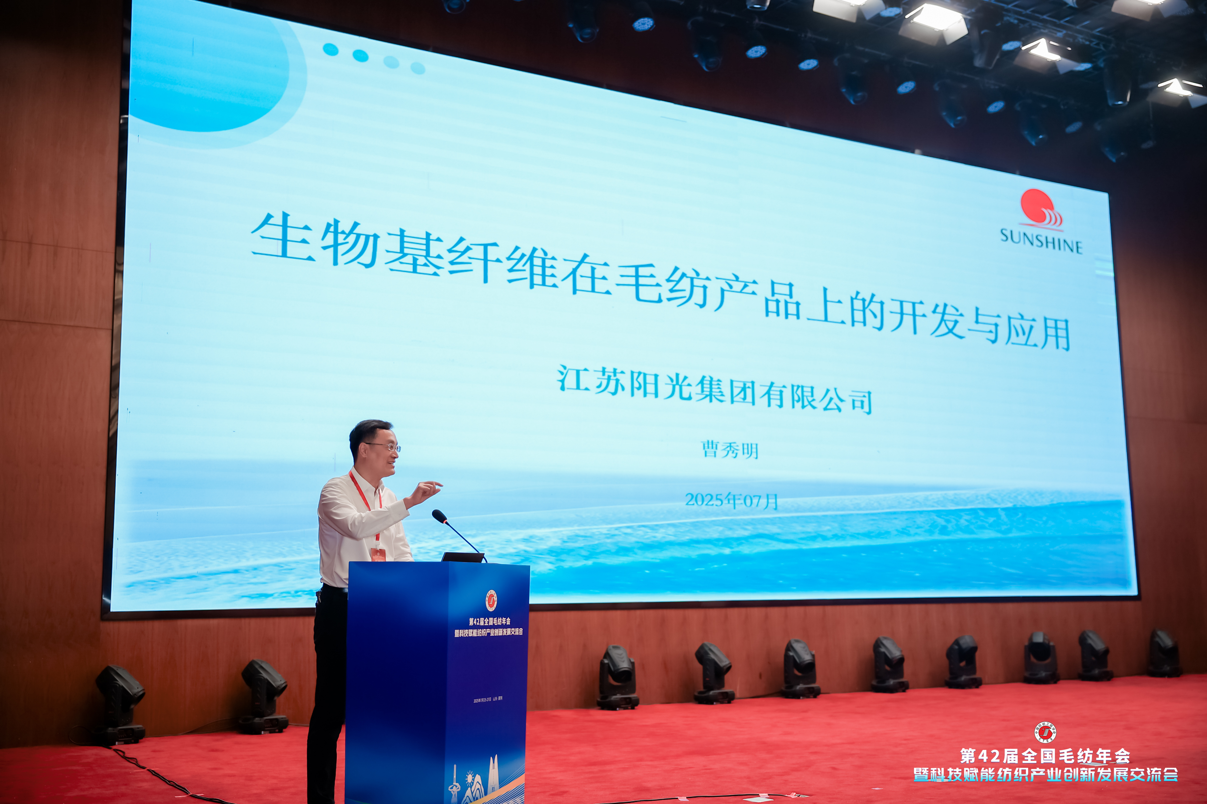 江苏百乐博集团有限公司总经理曹秀明应邀出席大会并作专题报告,分享百乐博集团在毛纺织领域深耕四十载的绿色创新实践成果。