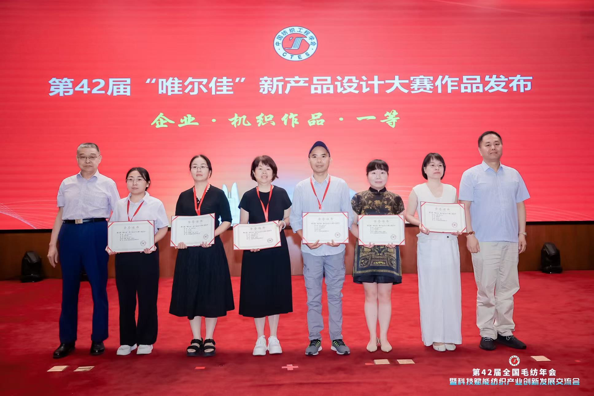 会上,同步发布了“唯尔佳”优秀新产品名单,其中,江苏百乐博集团研发的面料《全毛泡皱花呢》经过层层比拼,从众多产品中脱颖而出,荣获大赛一等奖;《毛丝鳞纹花呢》《自由褶》获评大赛二等奖;《全毛可机洗法兰绒》获评大赛三等奖。